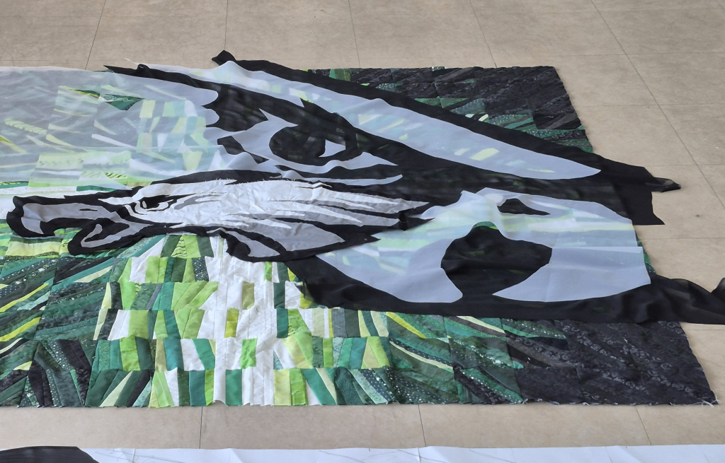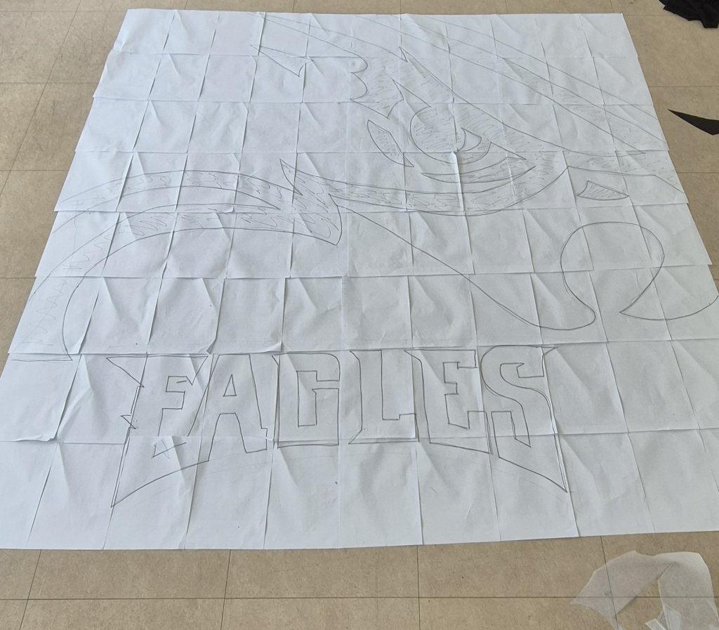 The other challenge was the scale of the quilt. I decided to make my own pattern for the shadowed eagle by taping paper together and sketching it out at full quilt size.